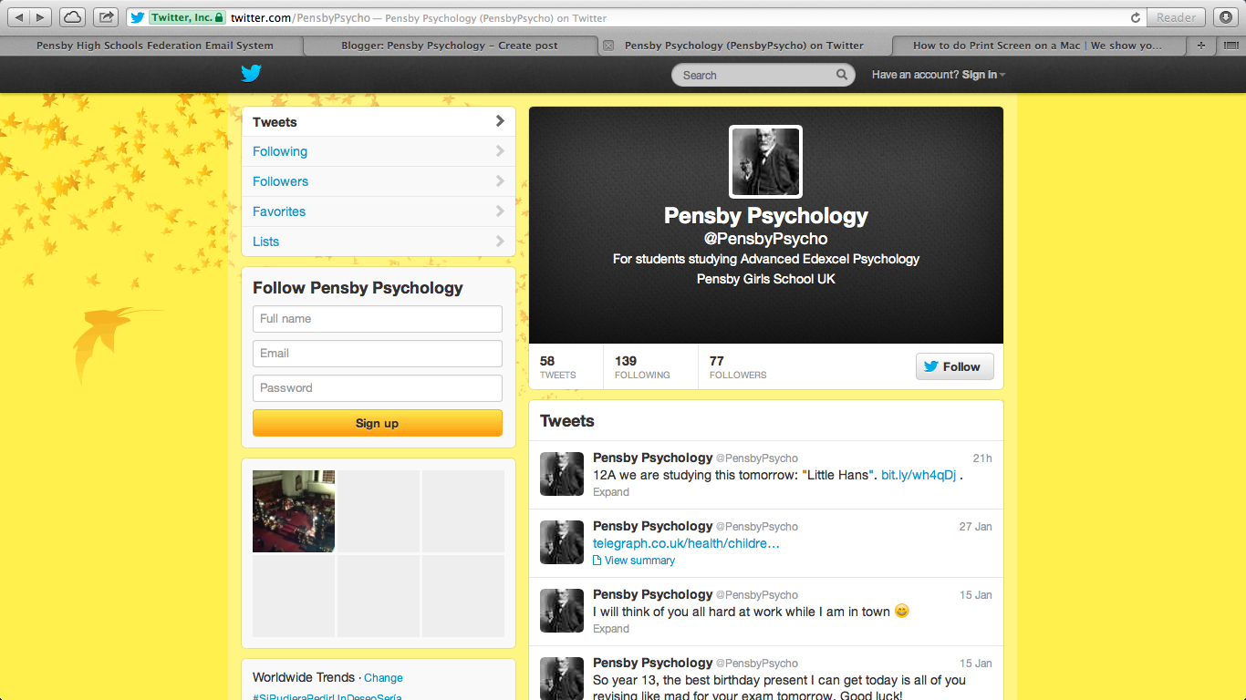 Remember that this is for display in Room 15 - remember I also teach Year 7! Make sure there is plenty of reference to Psychology. If you would prefer to make a real Twitter/ Facebook page that is fine - but you will have to print screen it and print it out to submit it.